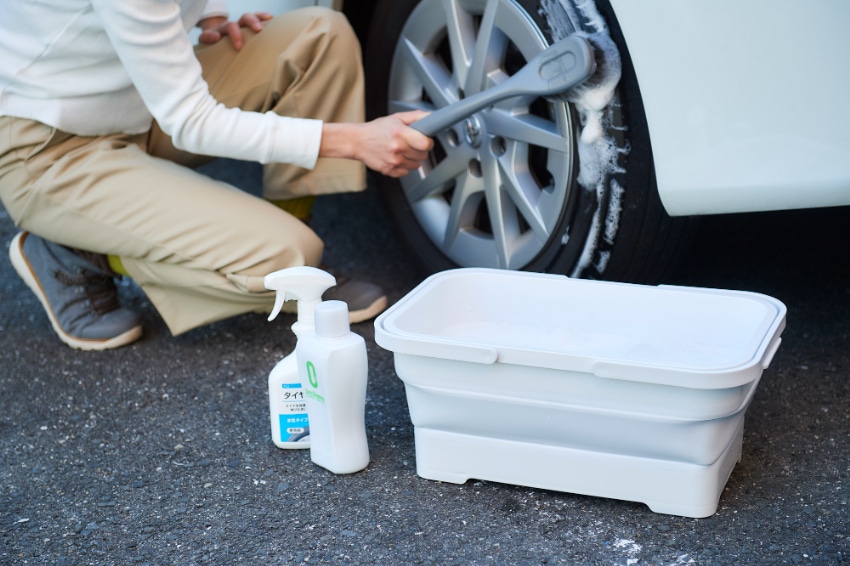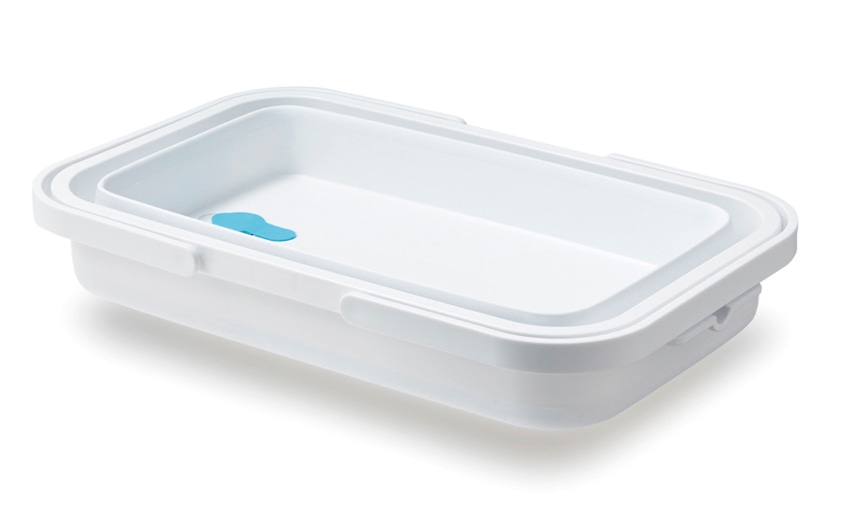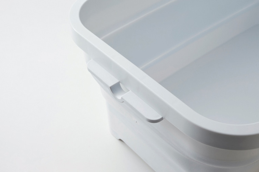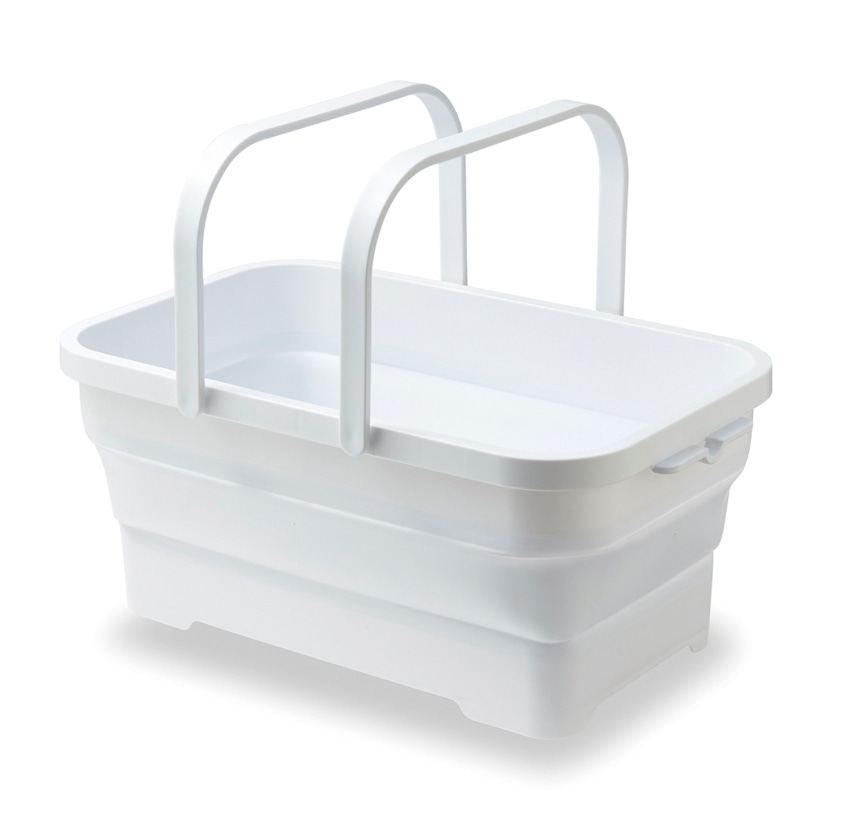 やわらか素材のたためるバスケット。水が溜められるので、洗濯物の浸け置き洗いやペットのお風呂などに便利。