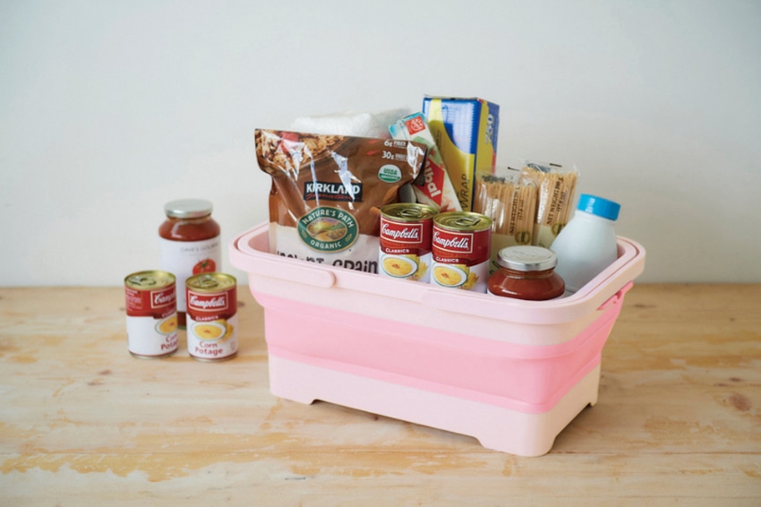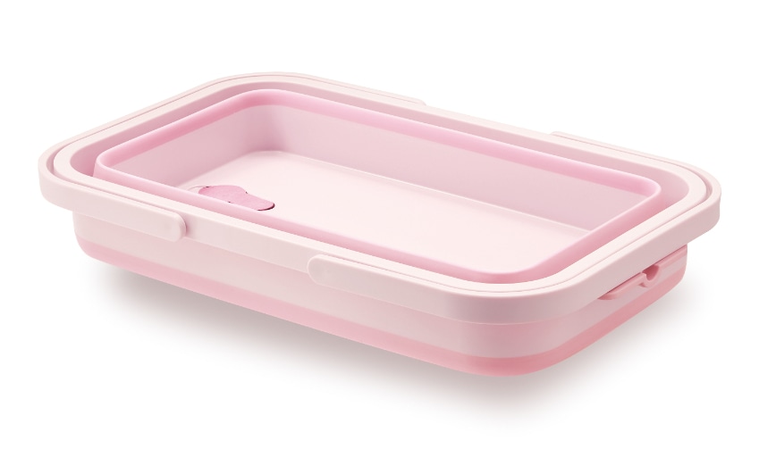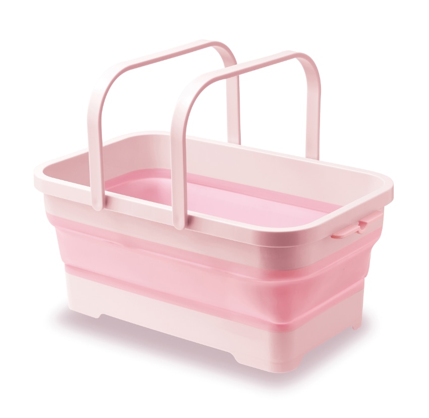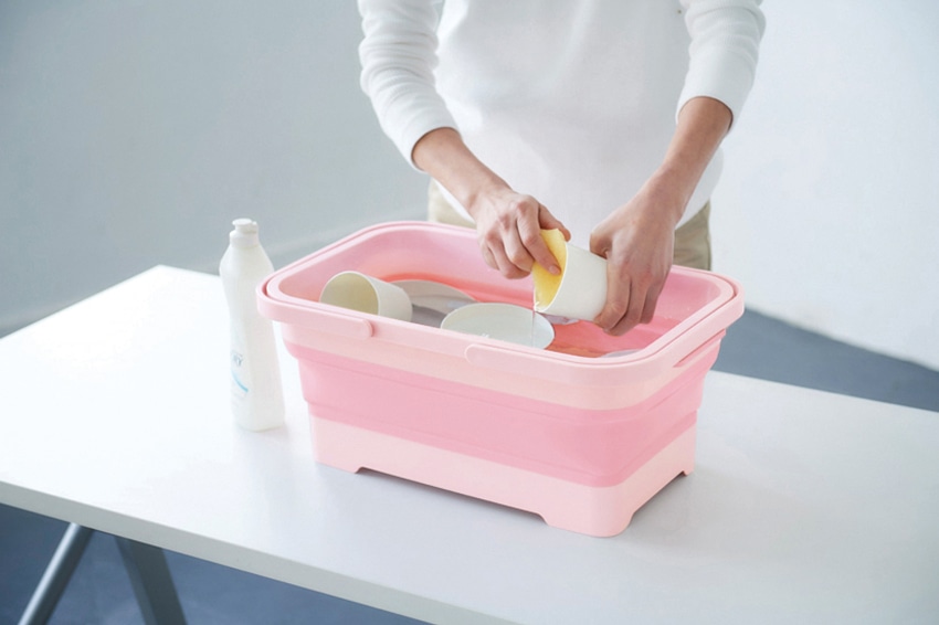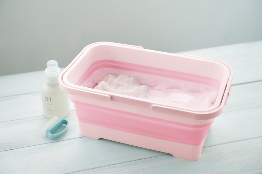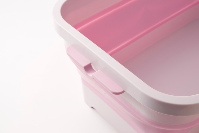 やわらか素材のたためるバスケット。水が溜められるので、洗濯物の浸け置き洗いやペットのお風呂などに便利。