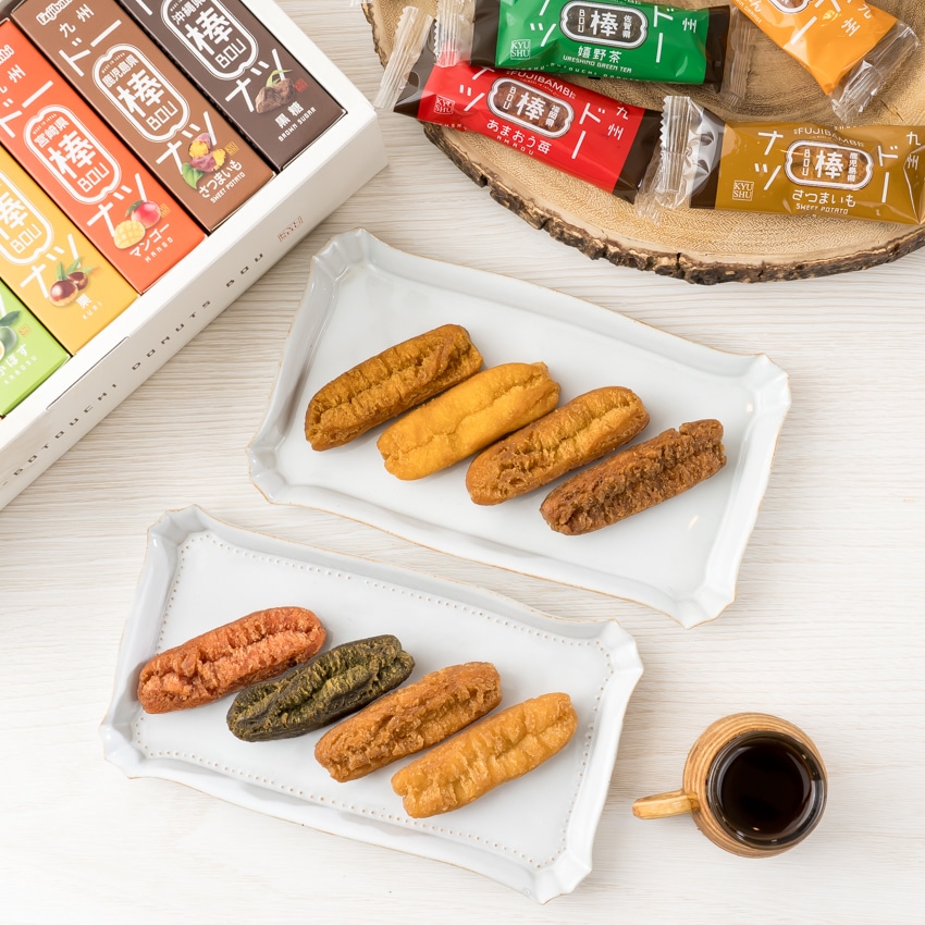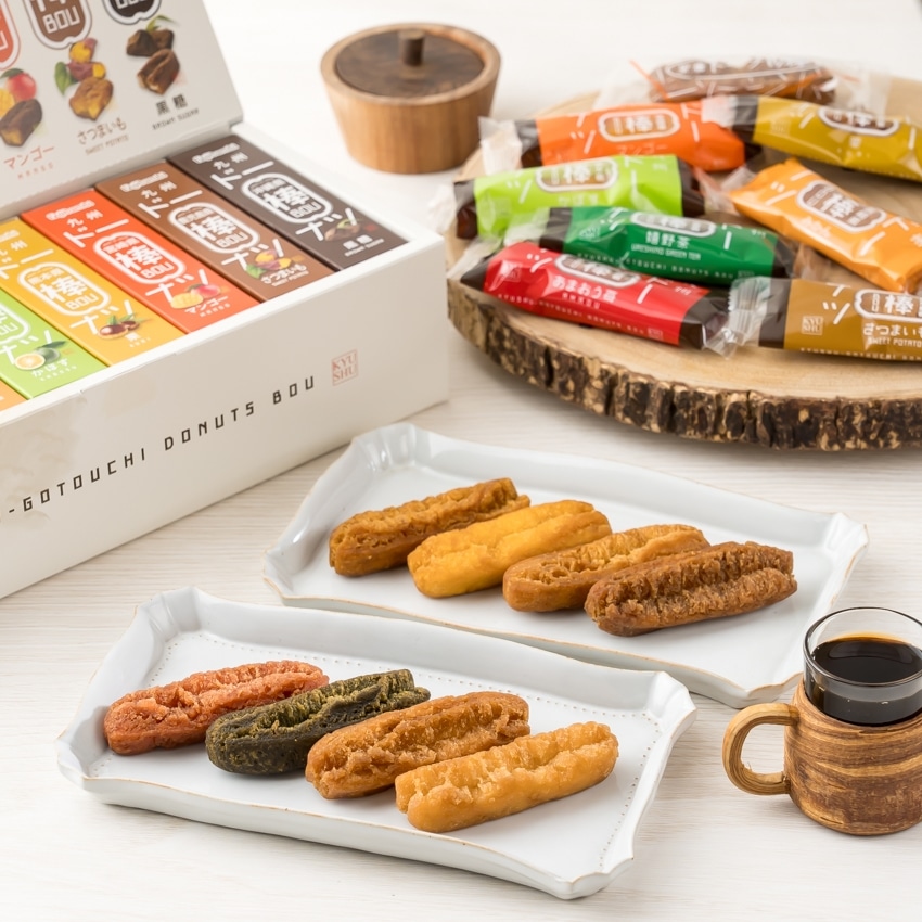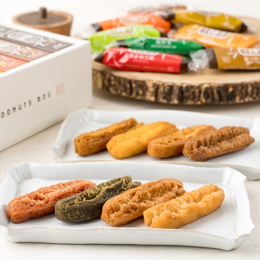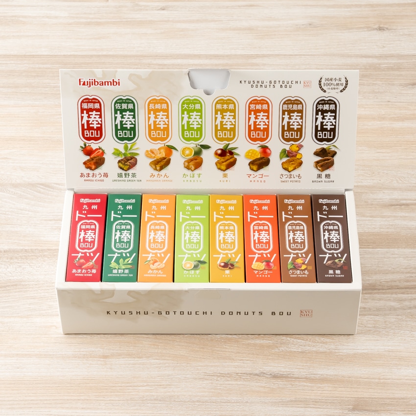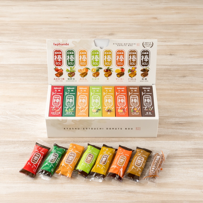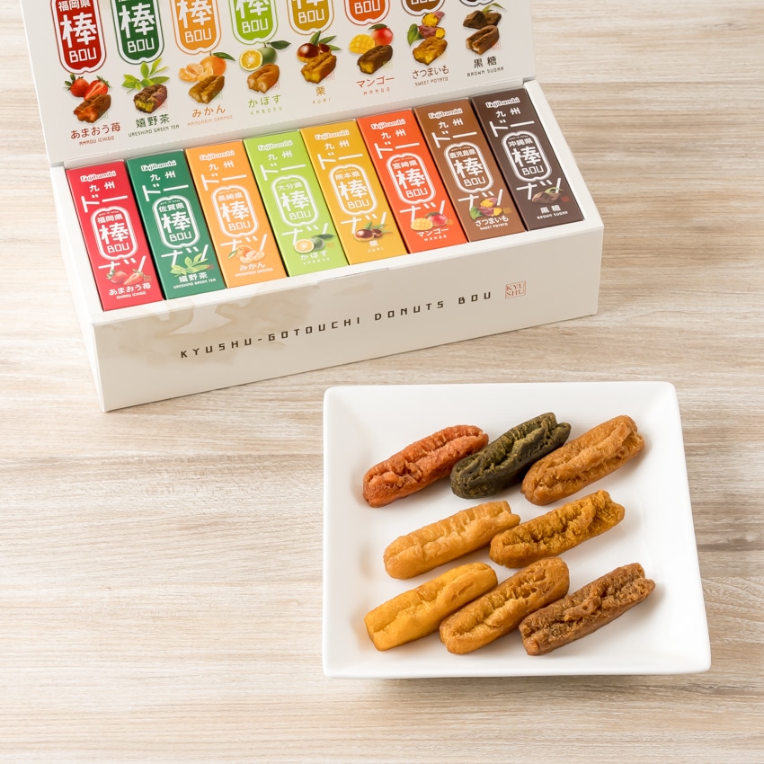 あまおう苺ドーナツ棒3本、嬉野茶ドーナツ棒3本、みかんドーナツ棒3本、かぼすドーナツ棒3本、