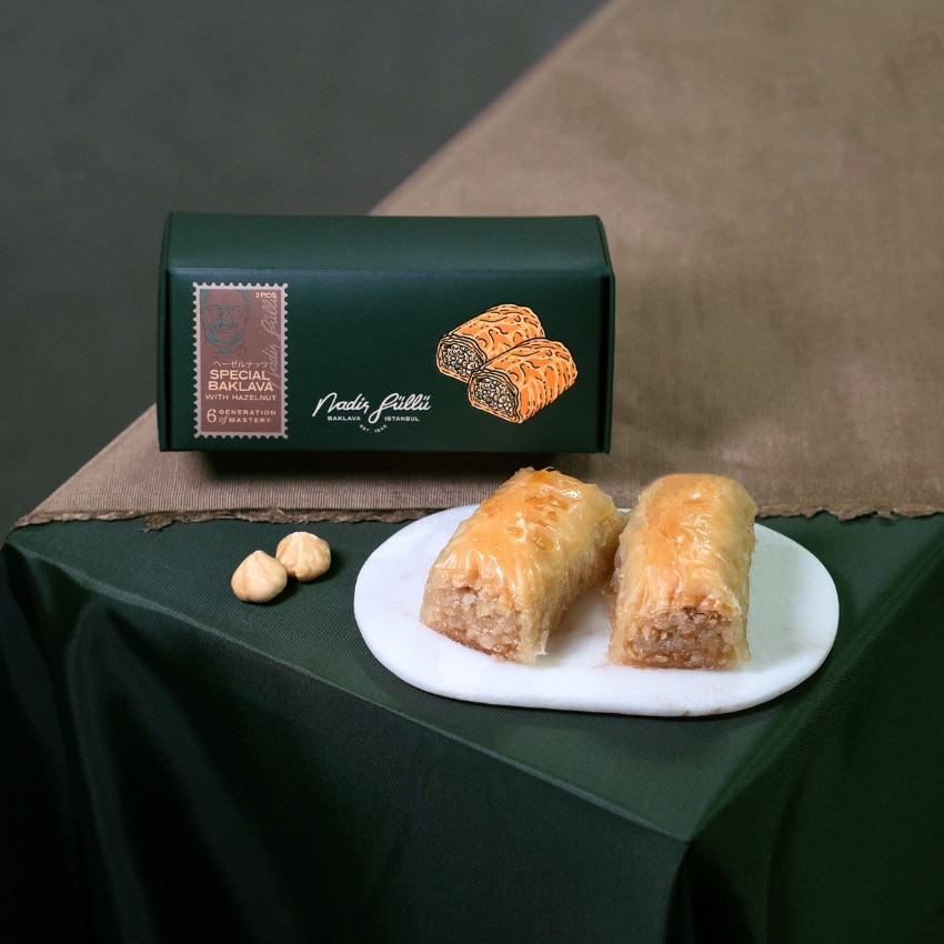 ヘーゼルナッツスペシャルバクラヴァ:ヘーゼルナッツをたっぷり入れて、ロールスタイルで仕上げたモダンなバクラヴァ。