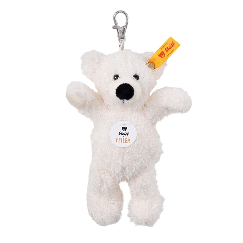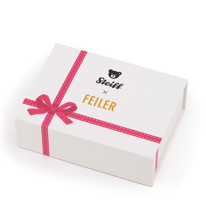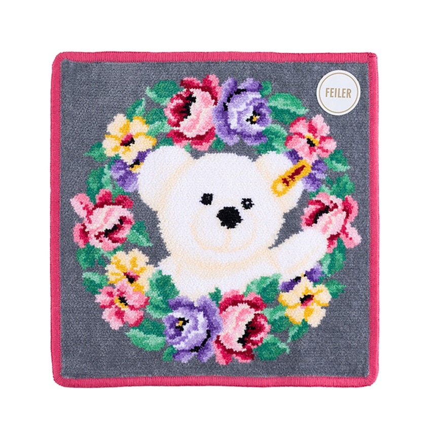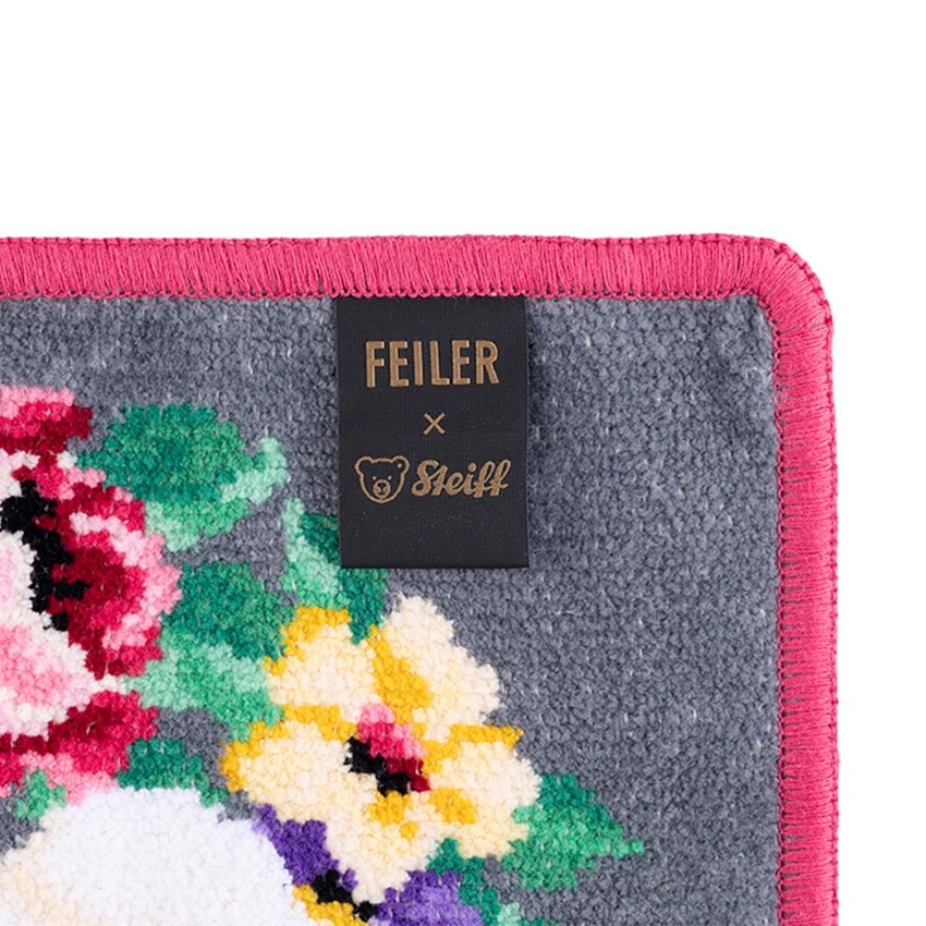 ロッテの愛らしい顔を中心に、フェイラーらしいフラワーデザインとともに仕上げたシュニール織のハンカチとキーリング「ロッテ」の胸元のチェストタグには、コラボレーションの証、「FEILER」と「Steiff」のロゴ入り。