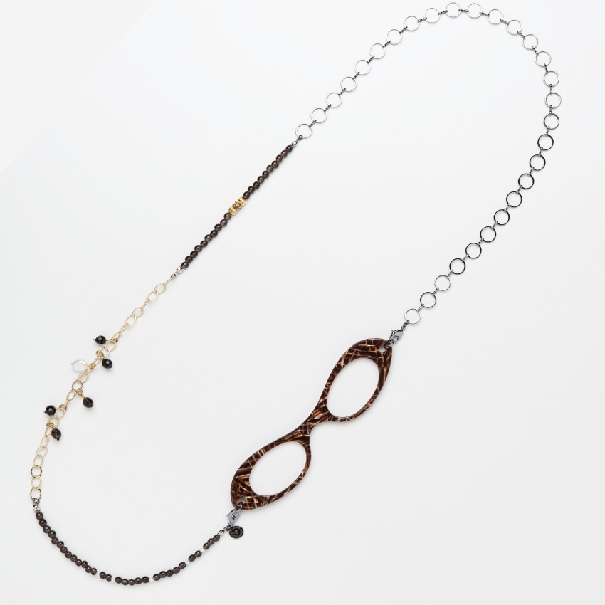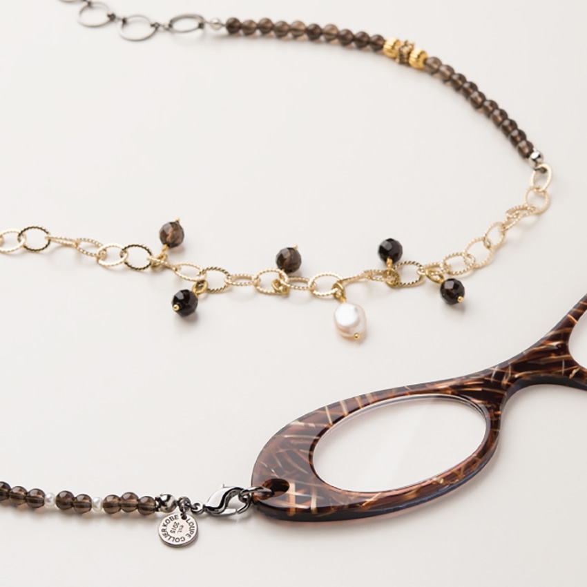 KOBE002のルーペはクリアなダークブラウンにメンズライクな模様を施した洗練されたデザイン。スモーキークオーツと淡水真珠をリズミカルに配置し、チェーンを使って軽やかさをプラス。揺れる部分にも淡水真珠とクオーツを使い、動きのある大人の魅力が感じられるデザインです