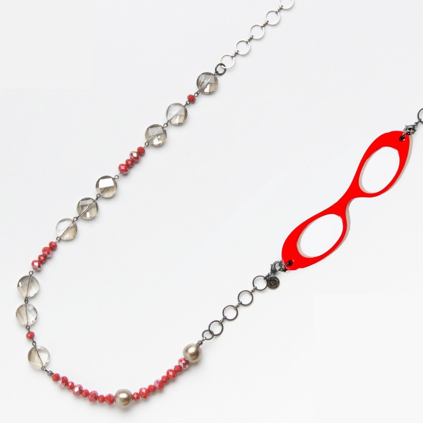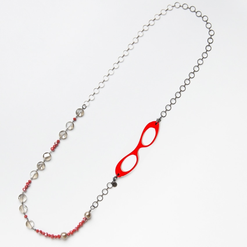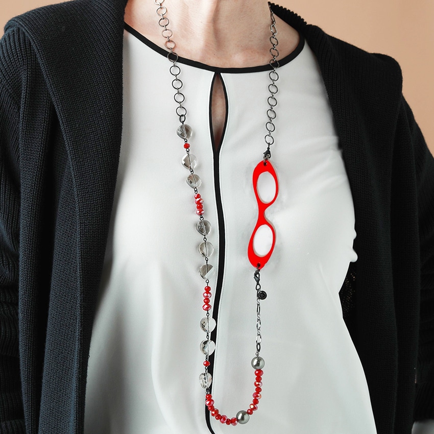 ネックレスは、兵庫県芦屋のアトリエでデザイナーと女性職人が、美しいルーペカラーとのベストマッチなロングネックレスを、「上質な素材」、「首に負担がかからない」、「モード」にこだわり、一つ一つ丁寧に制作し、最終的にルーペと繋げ、仕上げています。