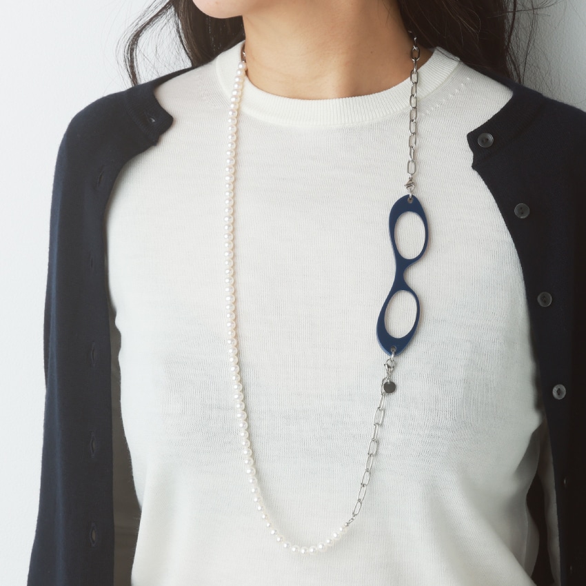 ルーペを外して、パールのロングネックレスとして、お手持ちのジュエリーとコーディネートをお楽しみ頂けます。1連でシンプルに、2重で華やかに首元を彩ります。
