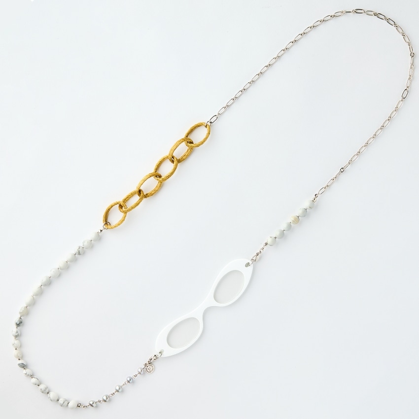 ネックレスは、兵庫県芦屋のアトリエでデザイナーと女性職人が、美しいルーペカラーとのベストマッチなロングネックレスを、「上質な素材」、「首に負担がかからない」、「モード」にこだわり、一つ一つ丁寧に制作し、最終的にルーペと繋げ、仕上げています。
