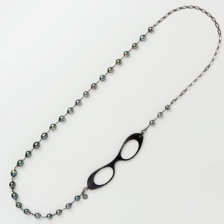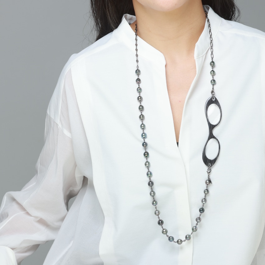 Fierte001、タヒチ産の艶と巻も美しい圧巻の黒蝶真珠を使用したルーペコリエです。素材の気品ある輝きがルーペカラーのブラックラメと相性も良く、エレガントに洗練されたシーンを演出します。ルーペを取り外して、ロングネックレスとして、首元に2重に巻いて、お楽しみ頂けます。