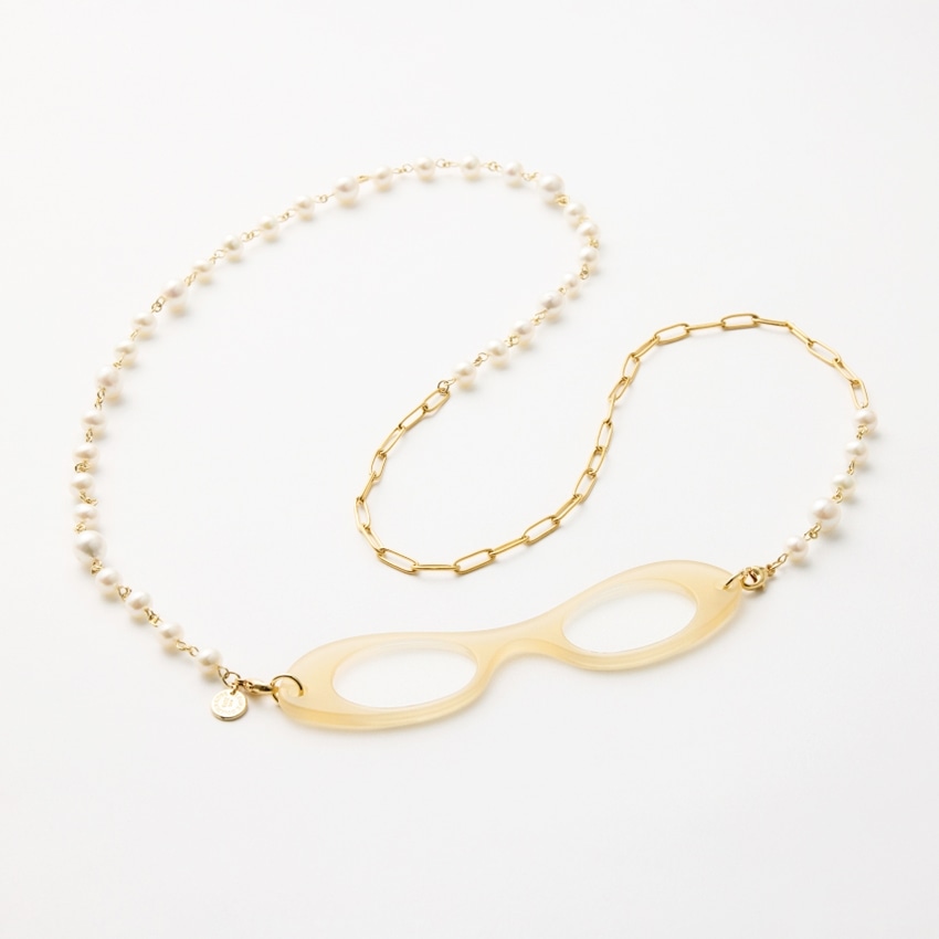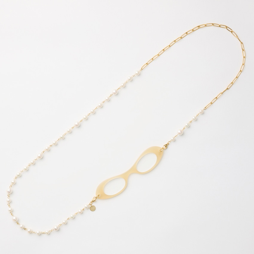 ネックレスは、兵庫県芦屋のアトリエでデザイナーと女性職人が、美しいルーペカラーとのベストマッチなロングネックレスを、「上質な素材」、「首に負担がかからない」、「モード」にこだわり、一つ一つ丁寧に制作し、最終的にルーペと繋げ、仕上げています。