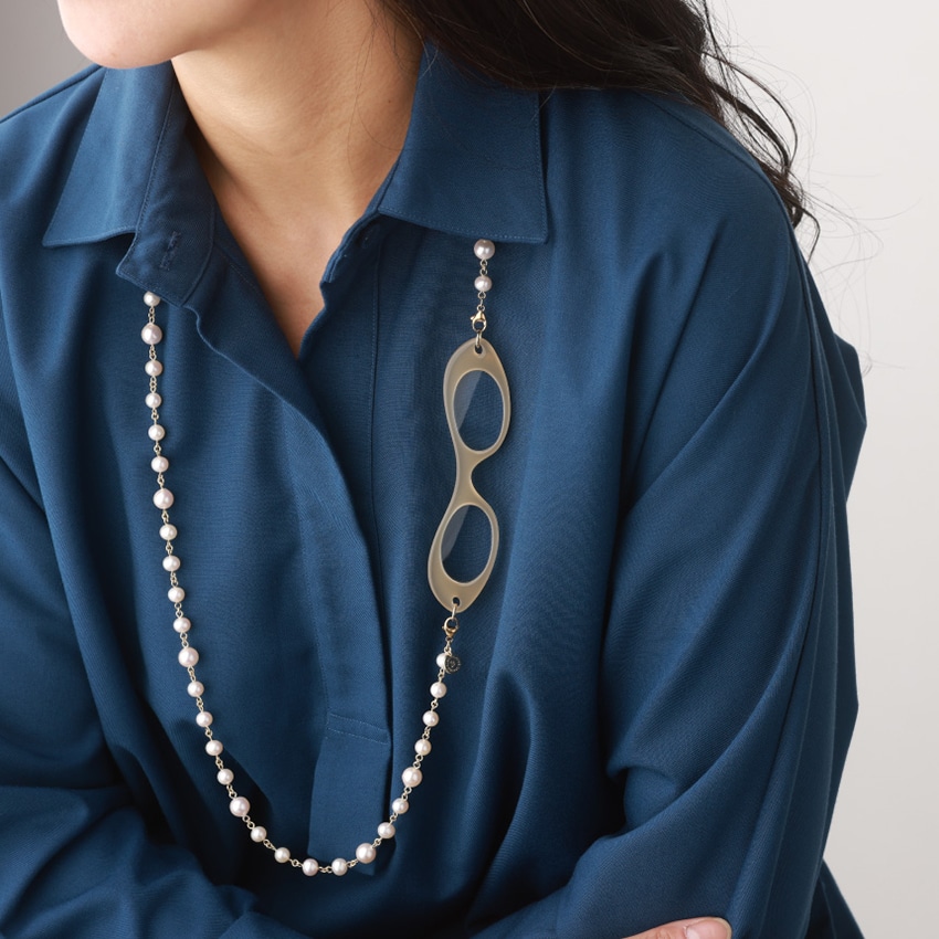 ルーペを外して、パールのロングネックレスとして、お手持ちのジュエリーとコーディネートをお楽しみ頂けます。1連でシンプルに、2重で華やかに首元を彩ります。