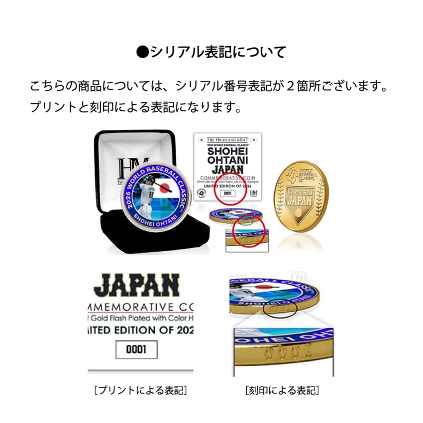 限定2026個のうち、一部数量を当ショップにて特別販売。さらにシリアルナンバー入りで、シリアル番号は、証明プレートへのプリントとコイン側面への刻印の2箇所に表記されています。WORLD BASEBALL CLASSICの記憶を形に残す、特別な記念アイテムです。