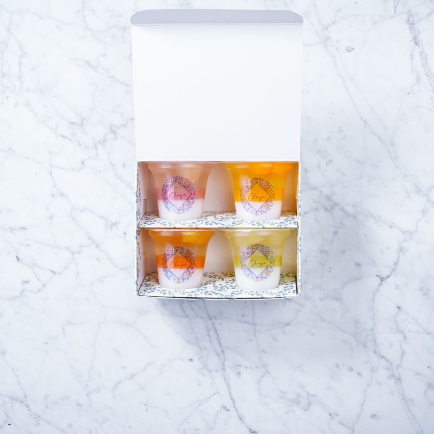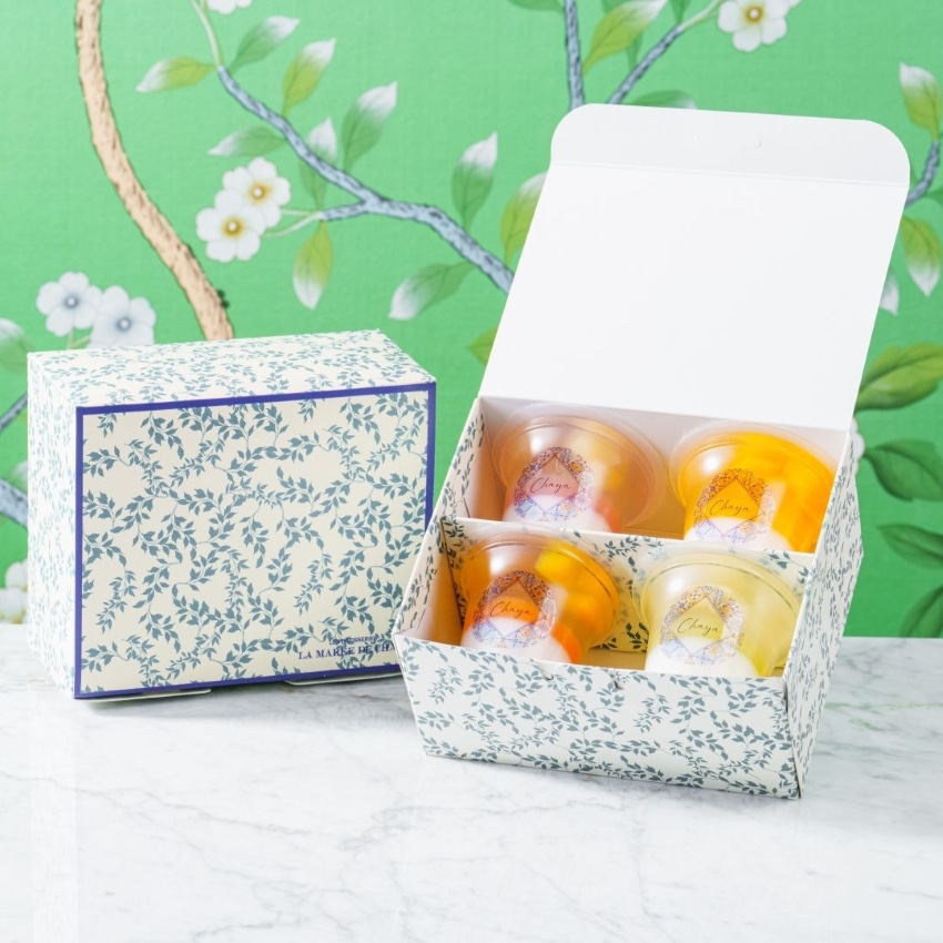 白桃・黄桃・マンゴー・洋梨の4種の果実が彩る、涼やかな仕立ては、ご自宅用はもちろん、季節の贈り物にも最適です。