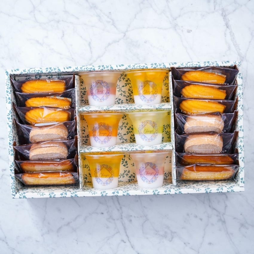 ■ 内容量:20個入(三層ゼリー白桃、黄桃×各2個、洋梨、マンゴー×各1個、マドレーヌ・シトロン×6個、ダクワーズ×4個、フィナンシェ×4個)