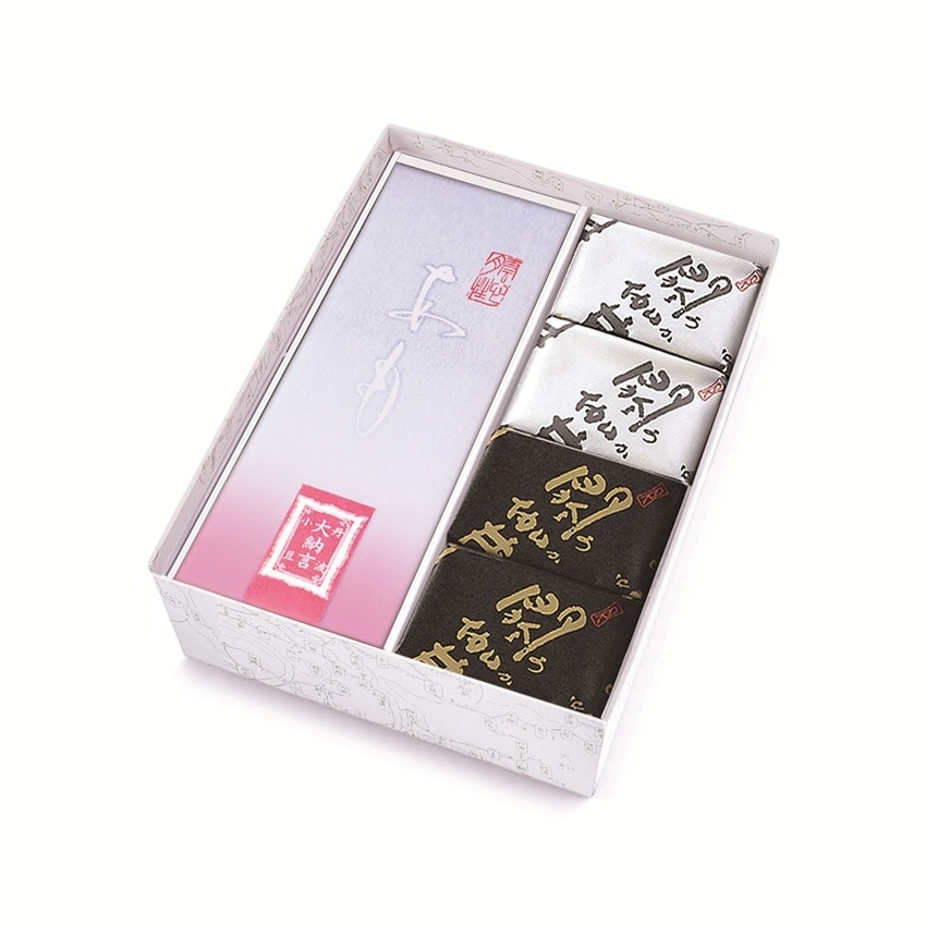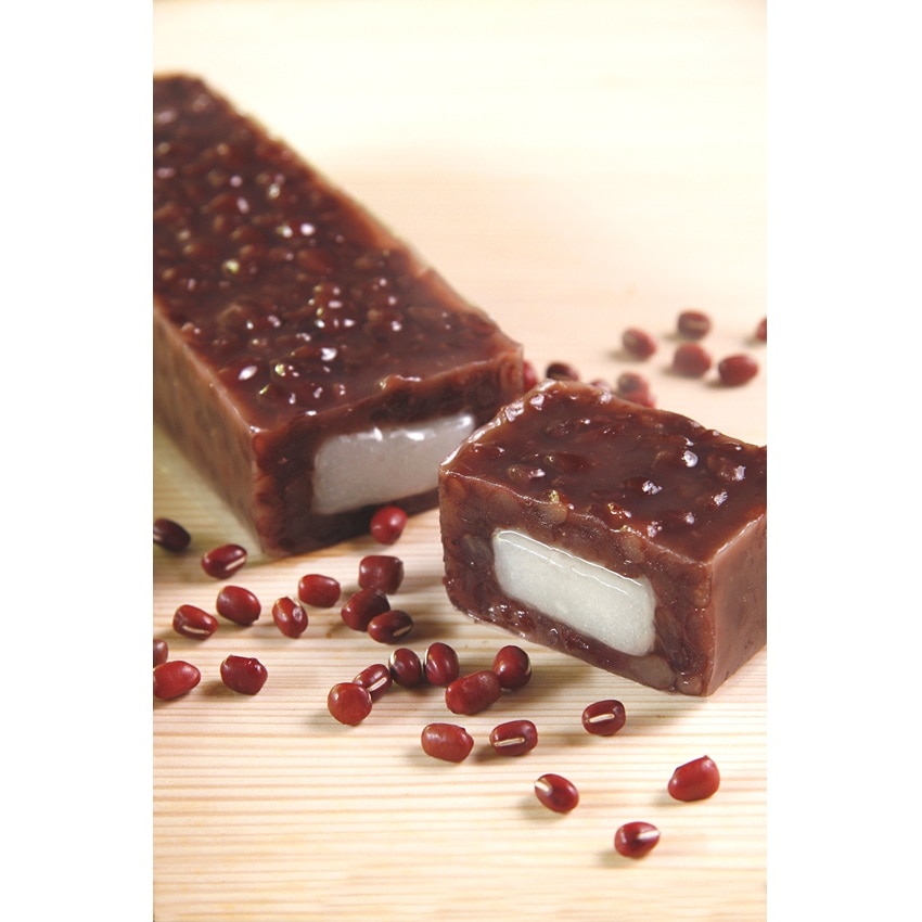 柔らかな求肥を大納言小豆で包んだ「あも」と、羽二重餅を使用した閼伽井(黒蜜きなこ・黒胡麻)の詰合せです。