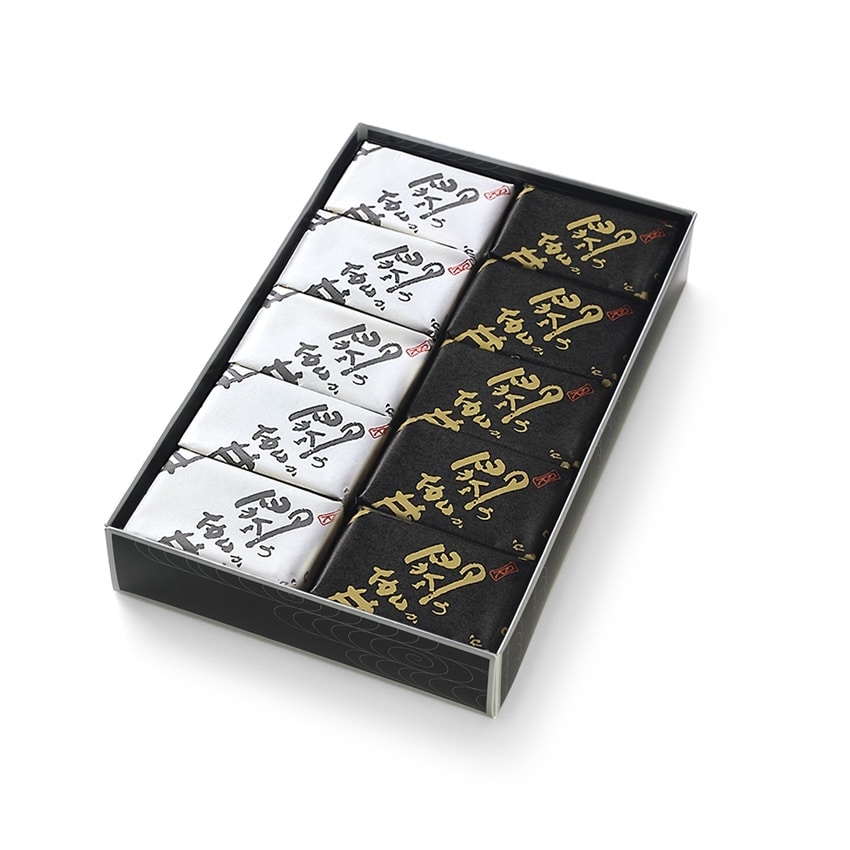 羽二重餅に香り高い、きな粉をまぶし黒蜜をかけてお召し上がり頂く(黒蜜きなこ)と焙煎したすりごまを使用した(黒胡麻)の詰合せです。
