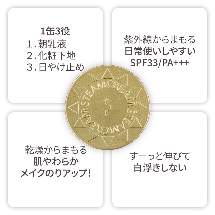 SPF33/PA+++で日常使いに最適。1缶3役(朝乳液+日焼け止め+化粧下地)なので朝の時短ケアにもおすすめです!