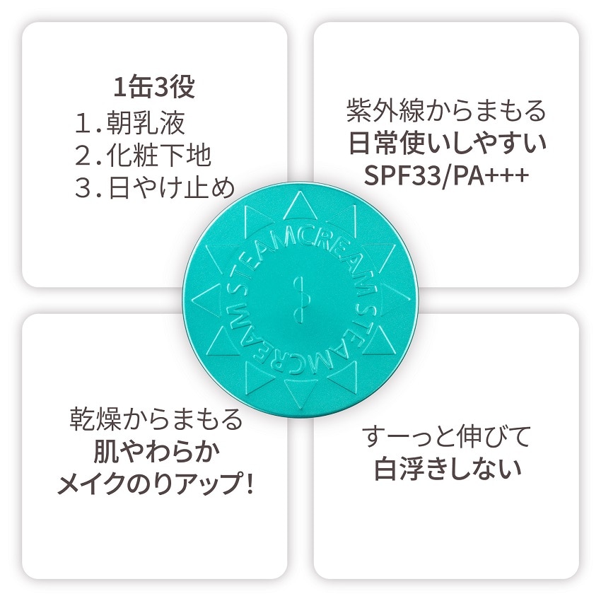 SPF33 PA+++で、日常使いに最適。1缶3役(朝乳液+日やけ止め+化粧下地)なので、朝の時短ケアにもおすすめです。