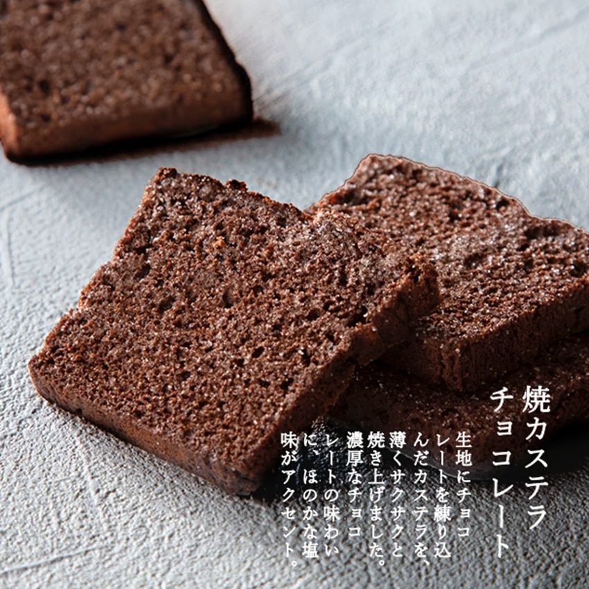生地にチョコレートを練り込んだカステラを、薄くサクサクと焼き上げました。濃厚なチョコレートの味わいに、ほのかな塩味がアクセント。