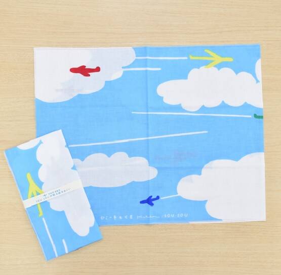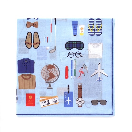 右半分はバカンス、左半分はビジネスで使用する小物をデザインした羽田空港限定のハンカチです。空を連想させる鮮やかな色合いで、お土産やギフトにも適しています。