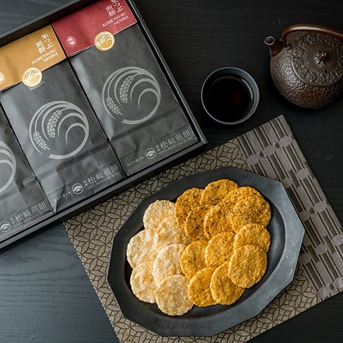 江戸時代創業の老舗「銀座 松崎煎餅」の手掛ける、おこげのような食感が楽しめる煎餅です。醤油味・味噌味・塩味の3種類の詰め合わせとなっています。