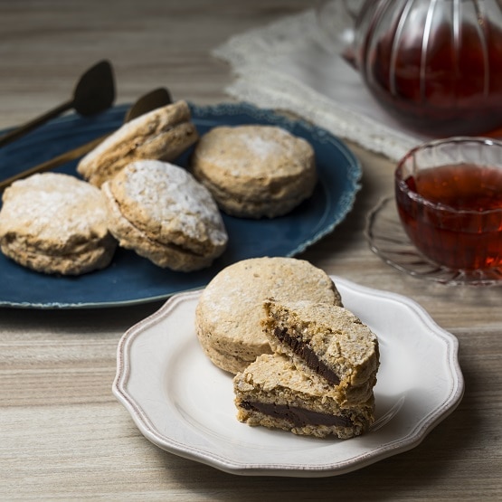 ヘーゼルナッツで作られたふんわり食感のダックワーズで、たっぷりのビターチョコクリームをサンドしました。優しい甘さが特徴の人気商品です。
