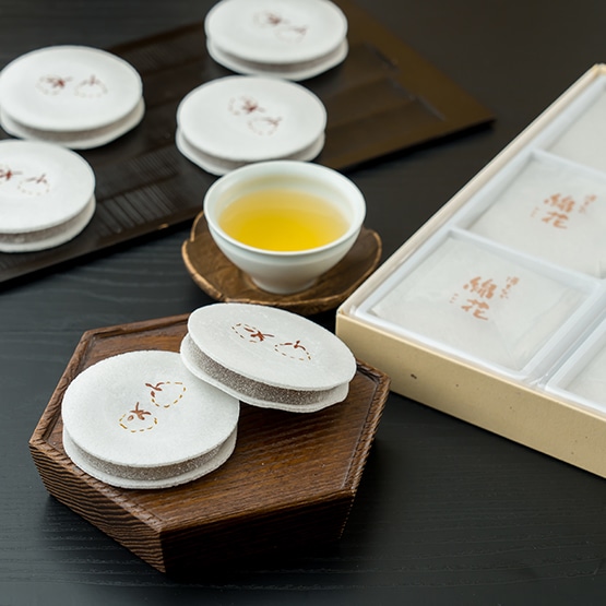 小豆こし餡をもっちりした求肥(ぎゅうひ)で包み、極薄のもなかでサンドしました。上品な口当たりのお菓子です。