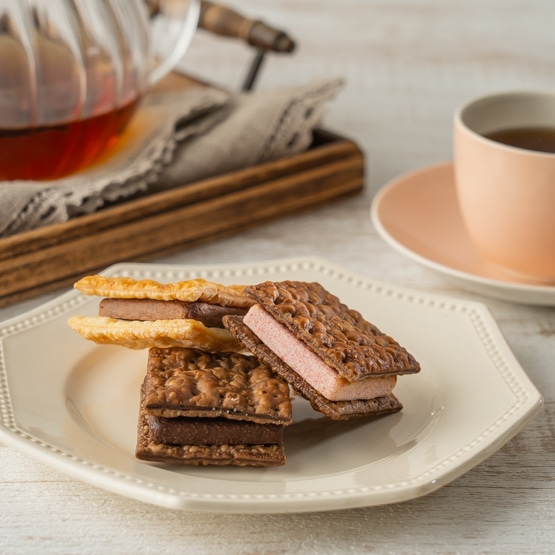 メープルシュガーを練り込み焼き上げたクッキーで、バター風味のチョコをサンドしています。程よいバランスの味わいで、販売以来愛され続けている商品です。