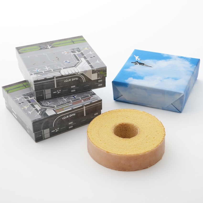 明治創業の老舗和菓子屋から生まれたパティスリー「CLUB HARIE(クラブハリエ)」が、昔ながらの製法で焼き上げたバウムクーヘンです。パッケージには、青空を飛ぶ飛行機が描かれています。