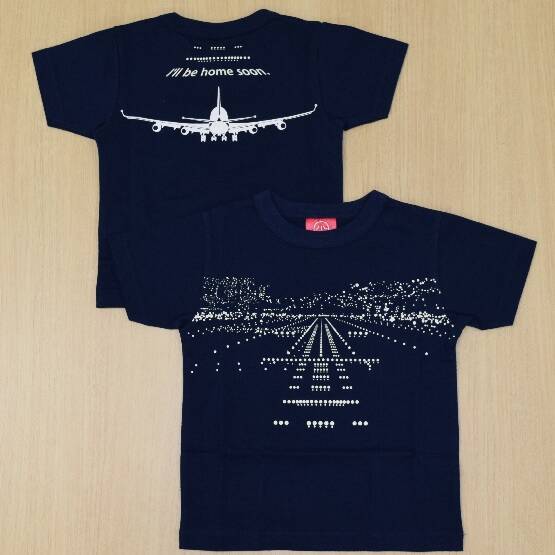 夜の空港をイメージしたデザインの子ども用Tシャツ。蓄光インクを使用しているので、暗い場所だとイラストが光ります。