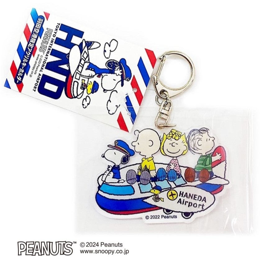 パイロット姿のスヌーピーや、飛行機に乗るキャラクター達の姿が描かれた、羽田空港限定デザインのアクリルキーホルダーです。