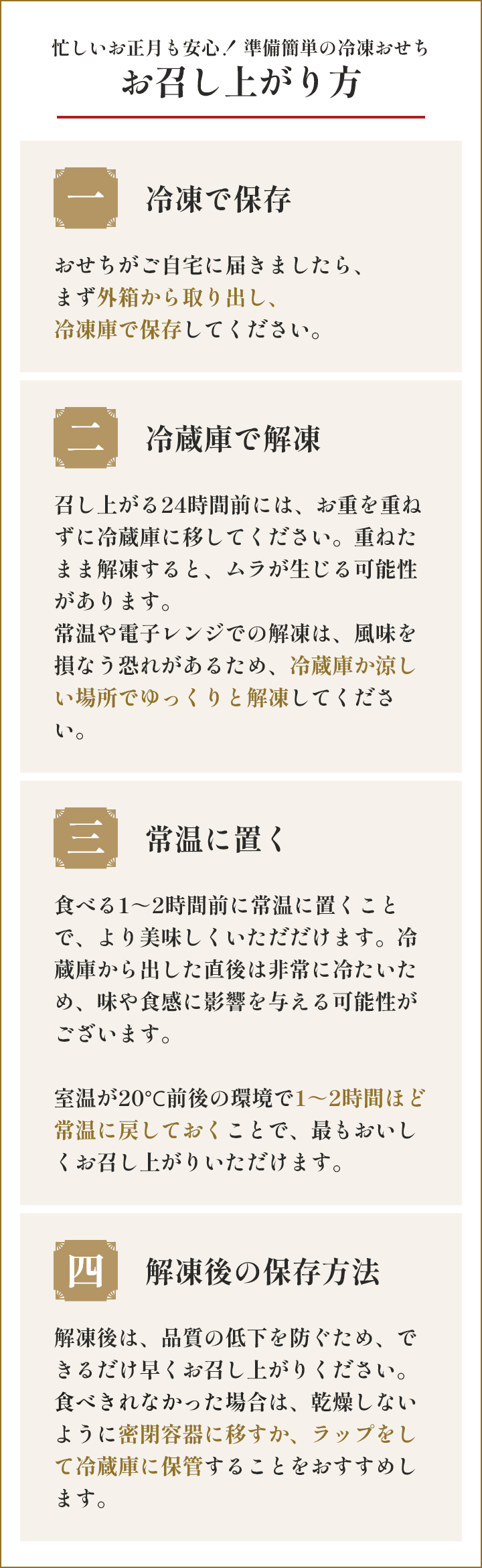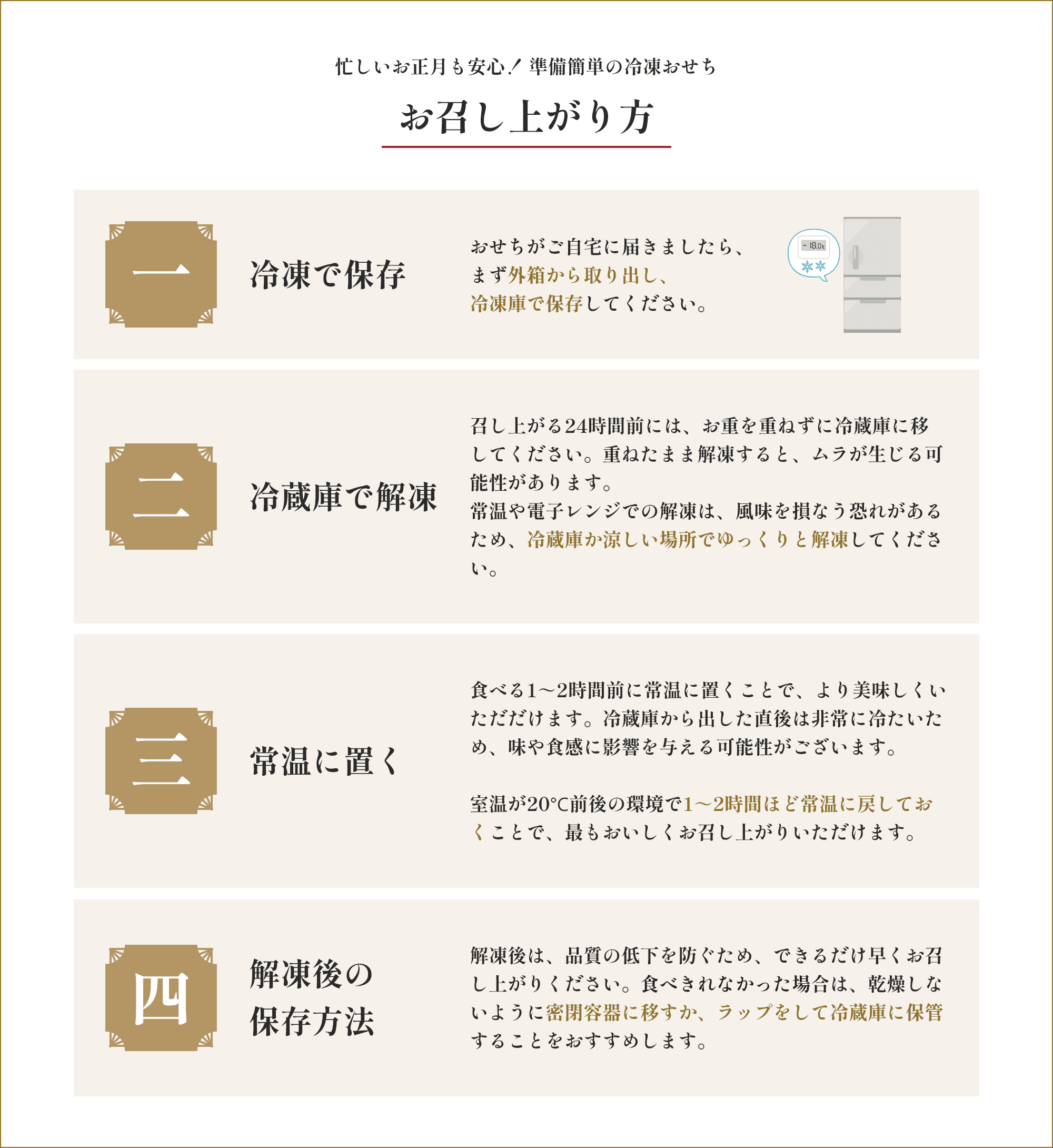 商品到着後は、速やかに表示されている保存方法で保存し、解凍後はお早めにお召し上がりください。