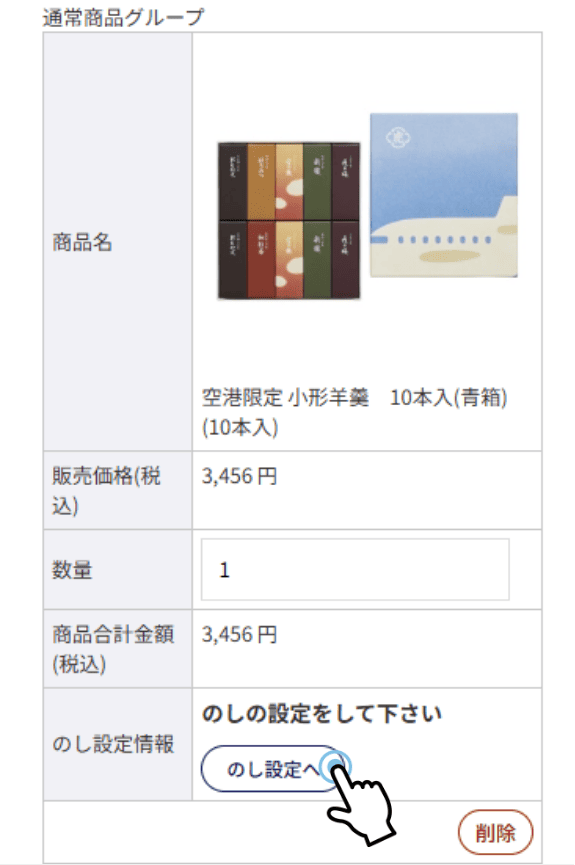 ご注文方法の指定ページにて熨斗を付けたい商品の「のし設定へ」を選択してください。